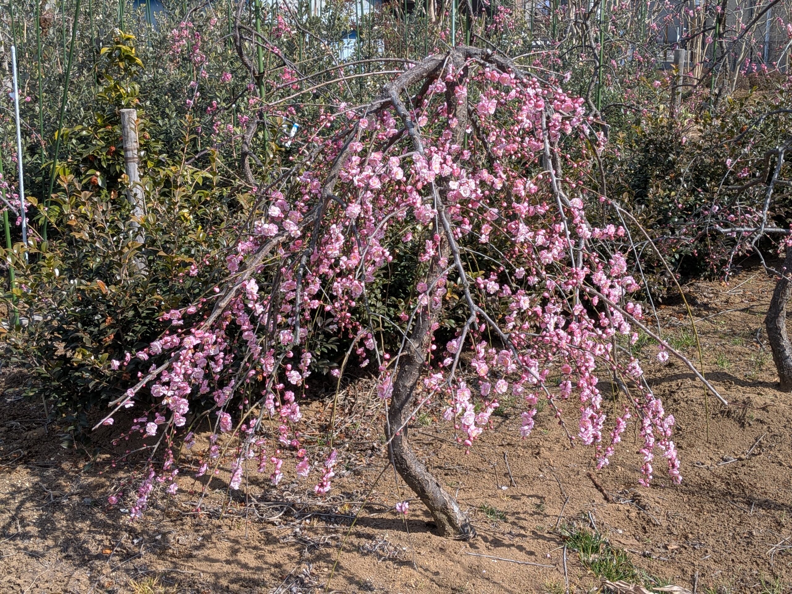 傘のように整えられた枝垂れ梅は、庭の中で圧倒的な存在感を放ちます。特に冬の間の枝ぶりや、春に一斉に咲き誇るピンクの花の姿は、まるで芸術品のようです。
