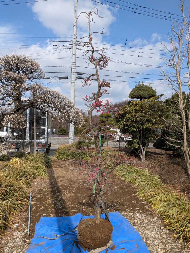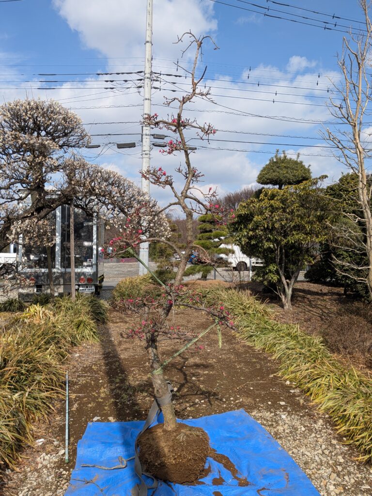 数ある紅梅の中でも、ひときわ鮮やかで深みのある紅色が特徴の**「紅千鳥(べにちどり)」。 今回ご紹介するのは、その美しい花を層状に楽しむことができる、希少な「段つくり」**仕立ての大型個体です。