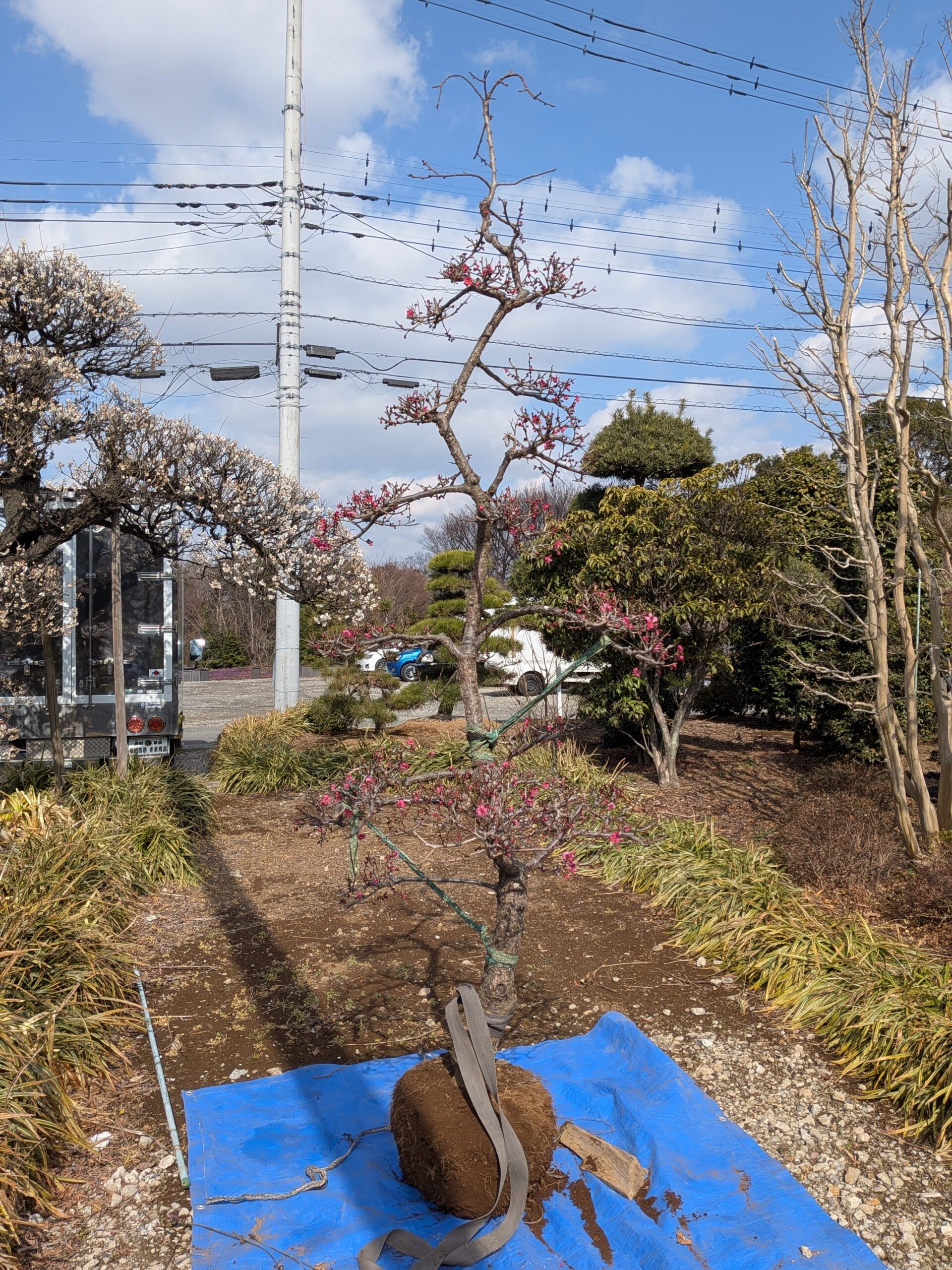 数ある紅梅の中でも、ひときわ鮮やかで深みのある紅色が特徴の**「紅千鳥(べにちどり)」。 今回ご紹介するのは、その美しい花を層状に楽しむことができる、希少な「段つくり」**仕立ての大型個体です。