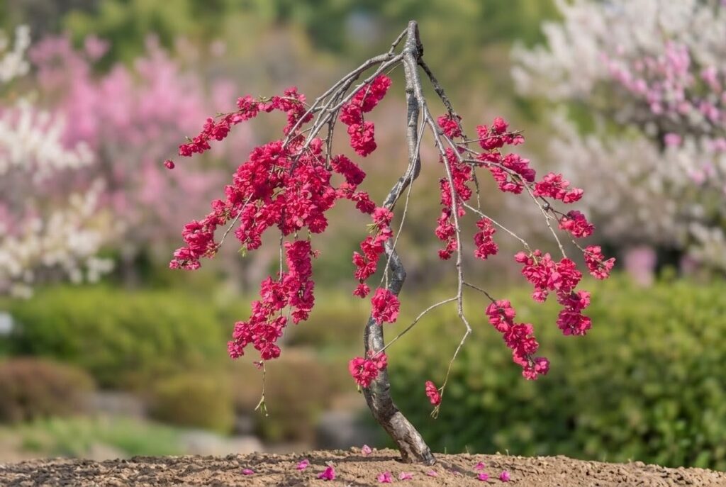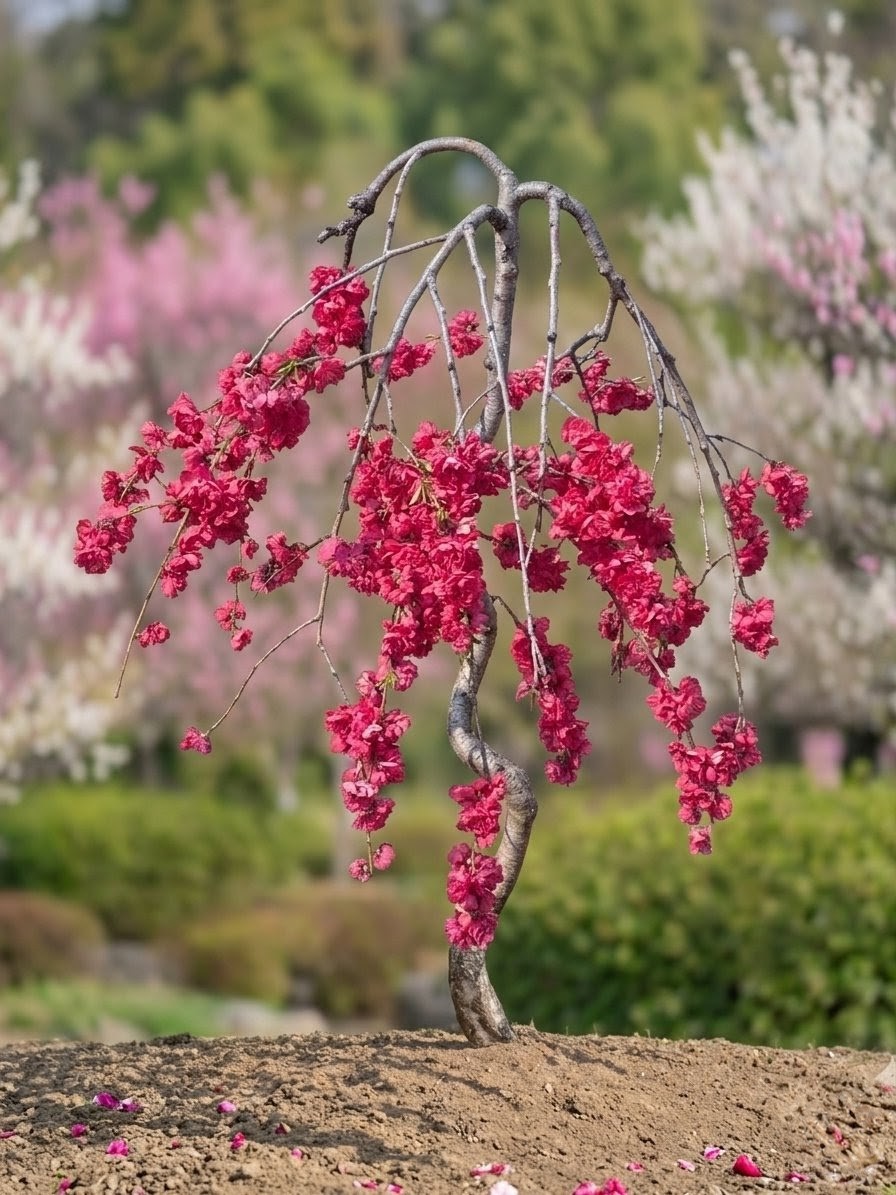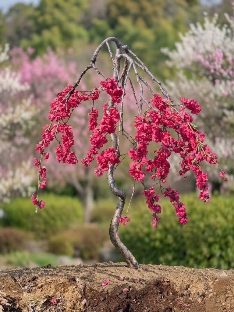 白や絞りが混ざらない分、満開時には燃え上がるような紅の色彩がお庭を圧倒的な華やかさで彩ります。傘仕立てによって整えられたその姿は、春の主役にふさわしい存在感を放ちます。