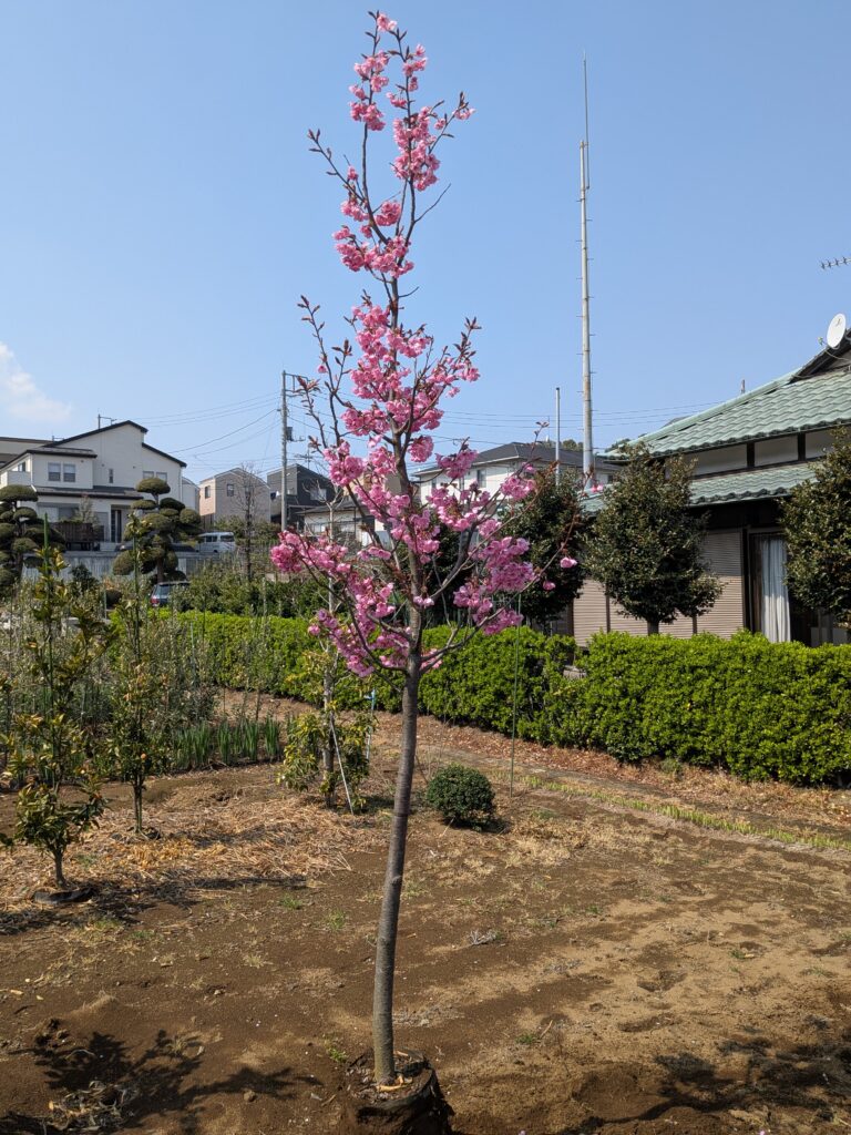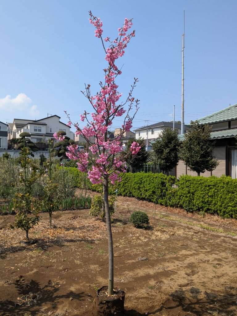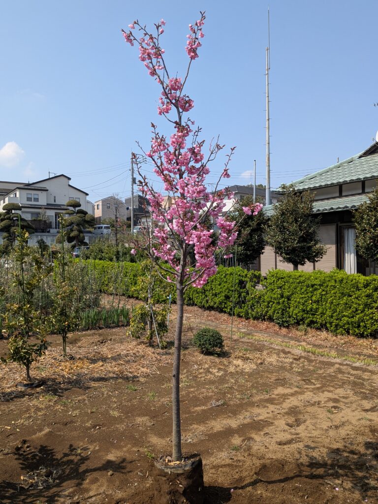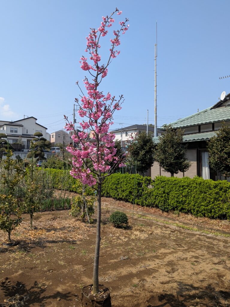 すでに2.5mという立派な樹高がありながら、幅は1.0m程度とスリムに整えられています。場所を取らずに、本格的な「お花見」を自宅で楽しめる贅沢な一木です。