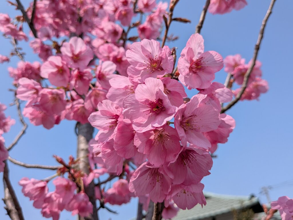 淡いピンクのソメイヨシノとは対照的に、パッと目を引く鮮烈な紅色は、お庭全体の雰囲気を一気に明るくしてくれます。開花時期が早いため、春を先取りして楽しむことができます。
