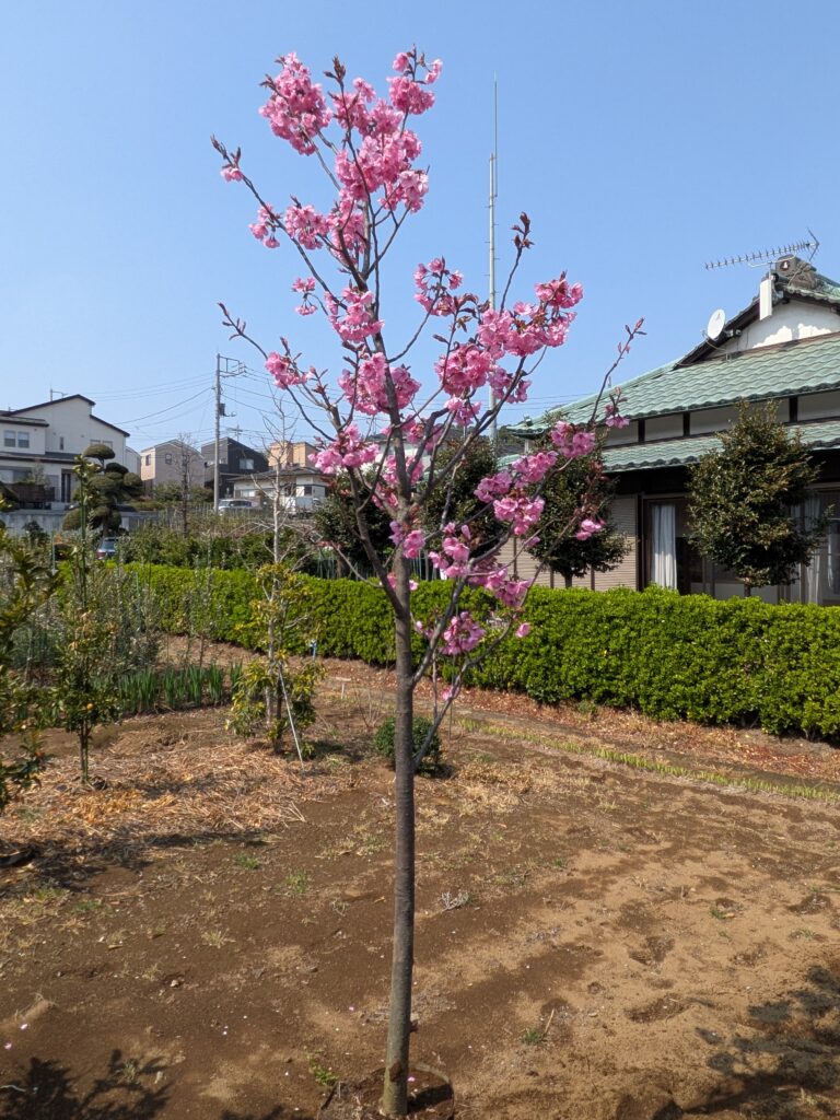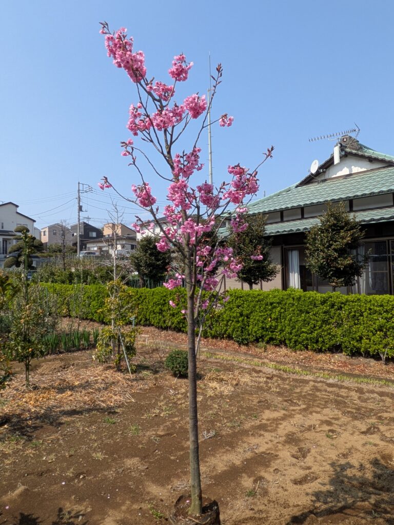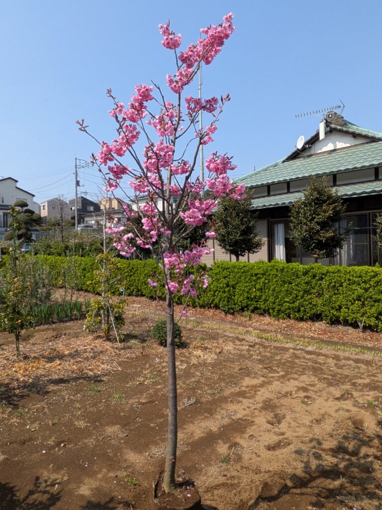 春を情熱的な紅色で彩るサクラ、**横浜緋桜(ヨコハマヒザクラ)**の別個体をご紹介します。 ソメイヨシノよりも一足早く開花し、大輪で濃いピンク色の花を咲かせるこの品種は、お庭にパッと明るい華やかさをもたらしてくれます。