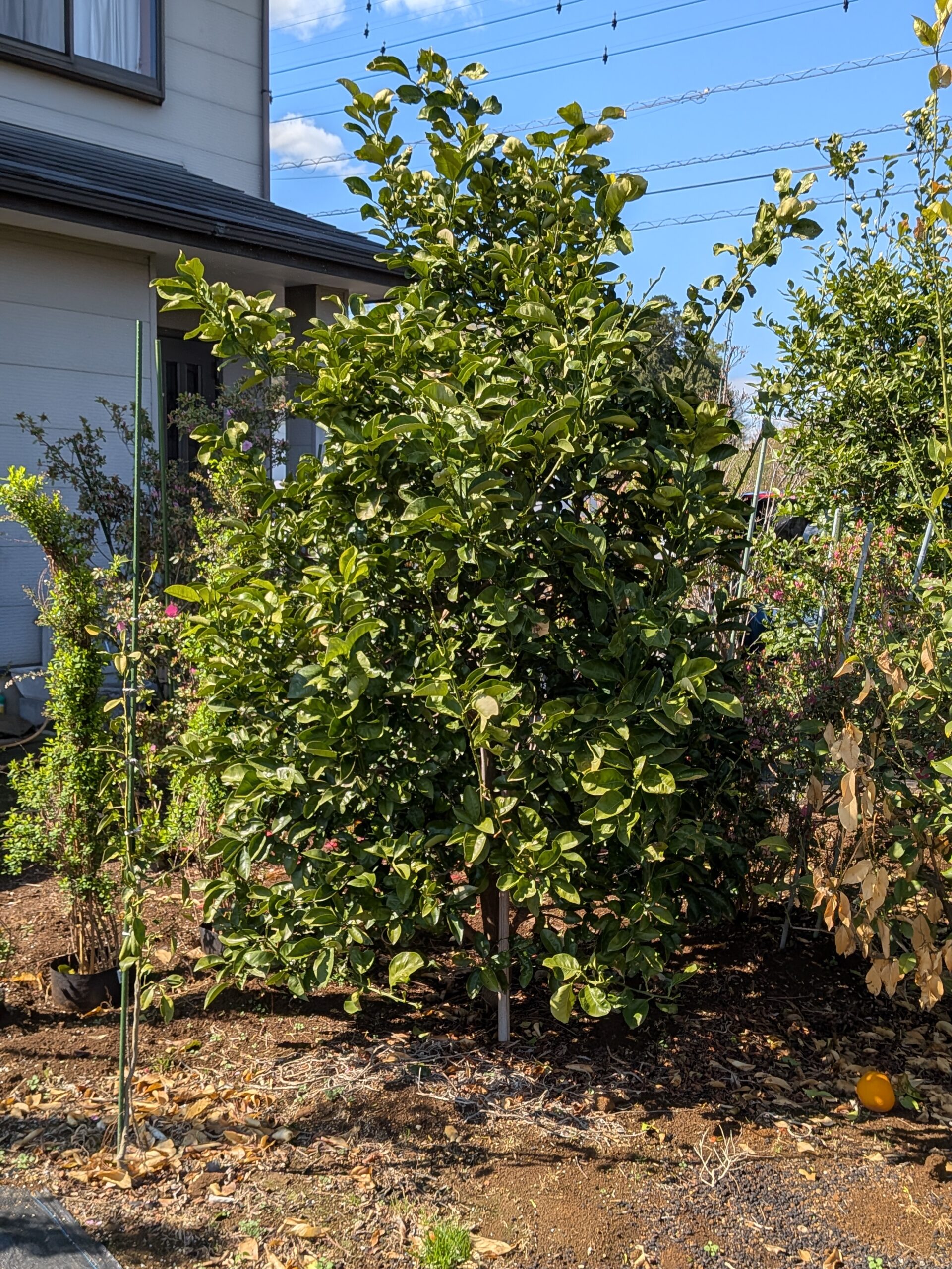 柑橘類は冬でも葉を落とさないため、一年中お庭の緑を絶やしません。2.6mという高さは、リビングからの目隠しや、お庭の背景を整える際にも非常に重宝するサイズ感です。