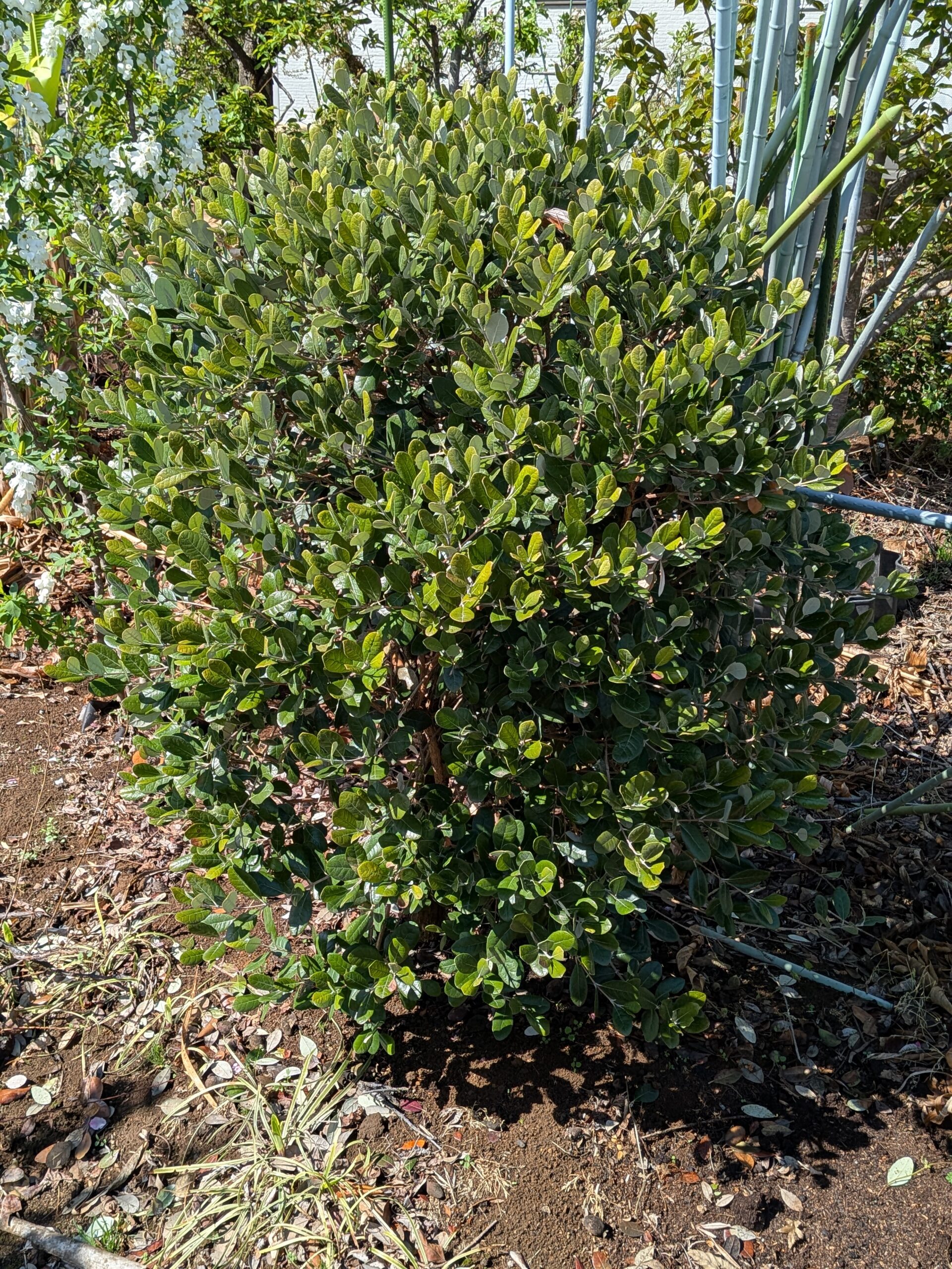 高さ1.3m、幅1.0mという非常にコンパクトで扱いやすいサイズ感。フェイジョアならではの洗練された葉色と、手入れの行き届いた造形美が組み合わさり、お庭のフォーカルポイント(視線を集める場所)として大活躍してくれます。
