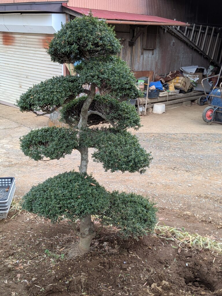 学名の crenata は「円鋸歯(丸みのあるギザギザ)状の」という意味で、葉の縁の形状を表しています。刈り込みに非常に強く、緻密に枝葉が茂るため、本個体のような美しい段作りや玉散らしなどの造形(トピアリー)に最適な樹種です。