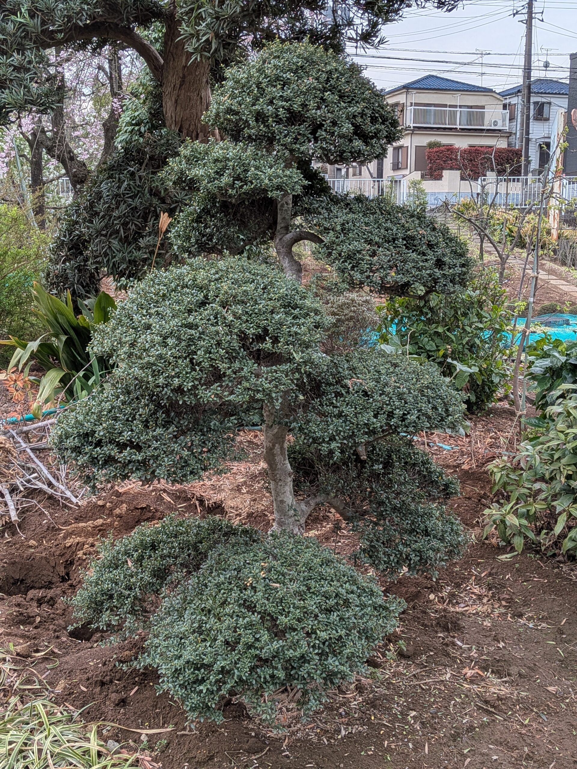 学名の crenata は「円鋸歯(丸みのあるギザギザ)状の」という意味で、葉の縁の形状を表しています。刈り込みに非常に強く、緻密に枝葉が茂るため、本個体のような美しい段作りや玉散らしなどの造形(トピアリー)に最適な樹種です。