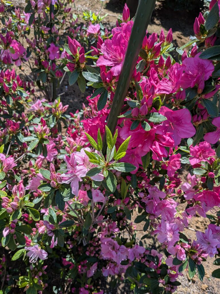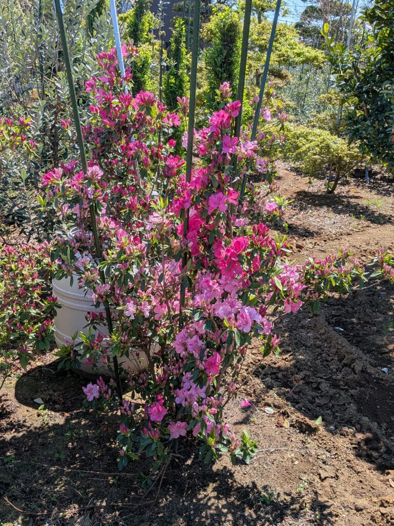 一般的に低く刈り込まれることが多いツツジですが、本個体は1.5mという大人の胸〜目の高さにまで成長した極めて希少な大型株です。株立ちならではの自然な樹形を活かし、和風庭園の主木や、洋風ガーデンの華やかなシンボルツリーとして確かな存在感を放ちます。