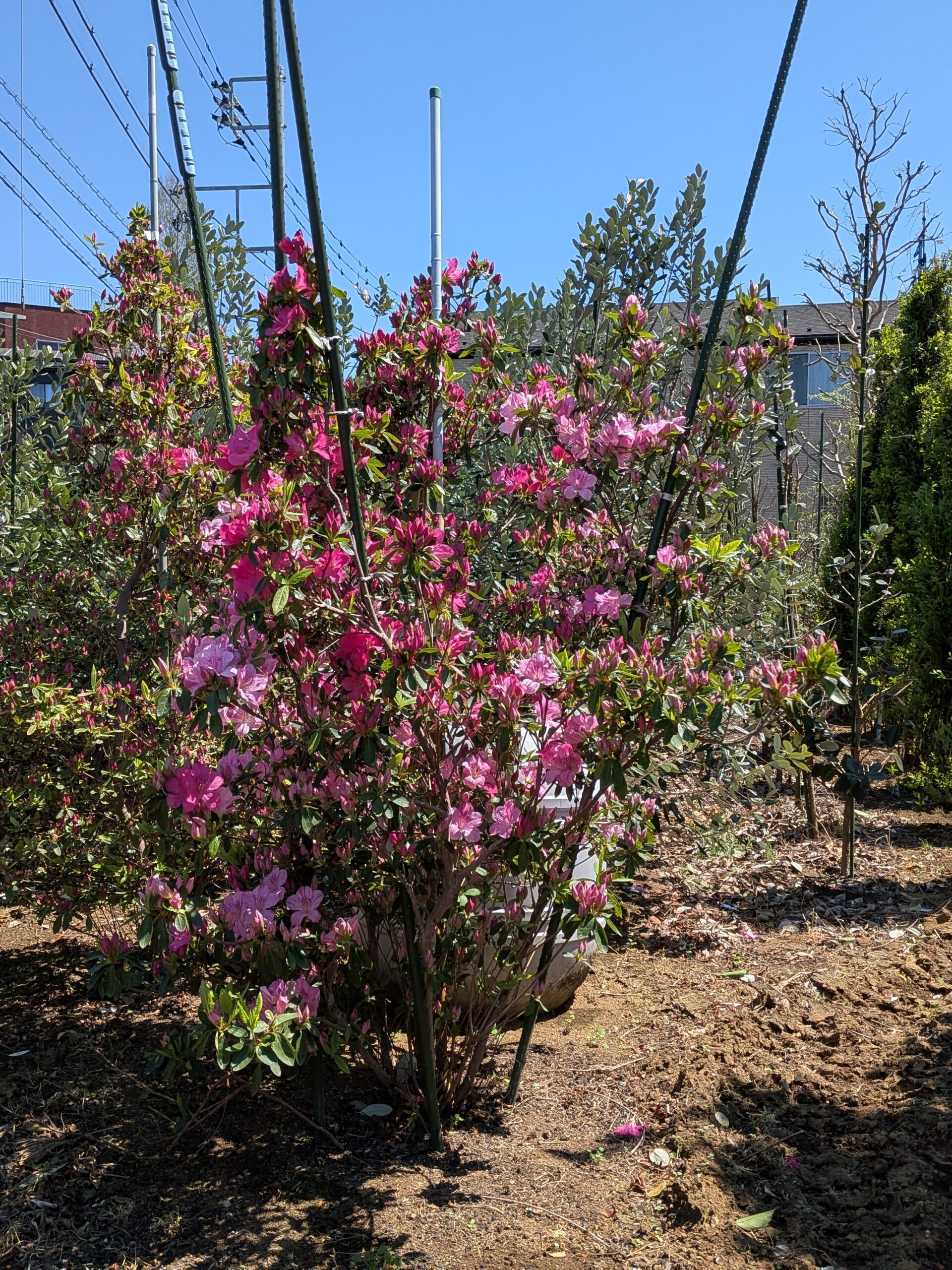 一般的に低く刈り込まれることが多いツツジですが、本個体は1.5mという大人の胸〜目の高さにまで成長した極めて希少な大型株です。株立ちならではの自然な樹形を活かし、和風庭園の主木や、洋風ガーデンの華やかなシンボルツリーとして確かな存在感を放ちます。